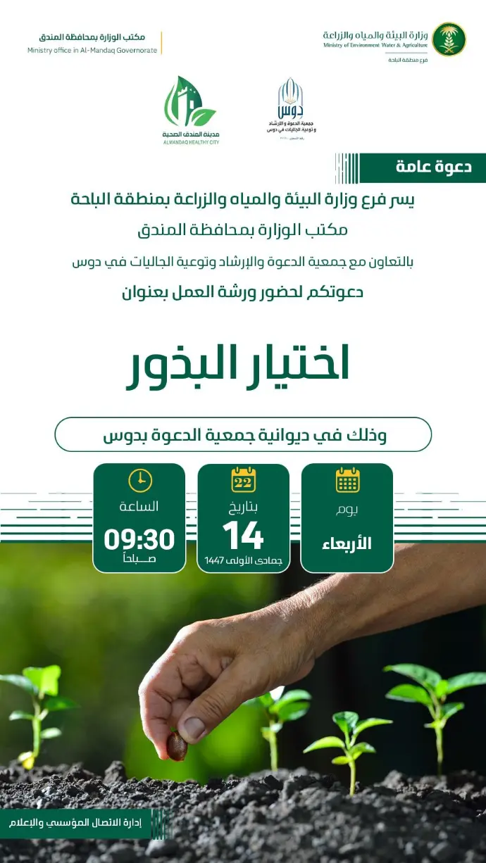 نفذ مكتب الوزارة بالمندق وبالتعاون مع جمعية الدعوة والارشاد بدوس ورشة عمل وذلك يوم الاثنين 14جمادى الاول من عام 1447هـ بعنوان اختيار البذور وتأتي هذه الشراكة ضمن رؤية الجمعية في تحقيق رؤية 2030